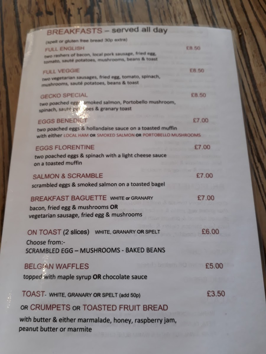 Start your day with an indulgent breakfast, featuring options like the **Full English** or the delightful **Eggs Benedict**. The **Gecko Special** adds a unique twist that keeps patrons raving. For coffee enthusiasts, their selection shines bright—try the **sensational macchiato** or the rich **flat white**, crafted with precision from premium beans.